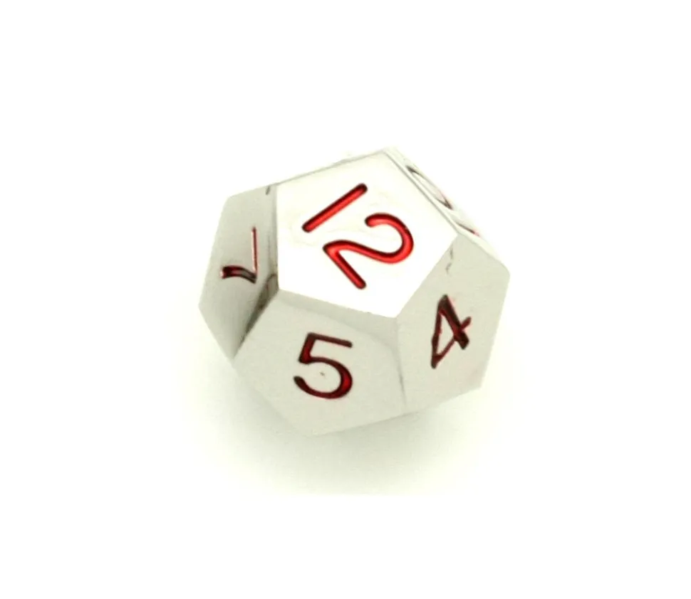 Dé à jouer en métal lourd de 12 faces avec chiffres rouges de 1 à 12. Super agréable, le métal donne du poids à vos lancer de dés. Dé métal argent de 20 mm avec 12 faces : chiffres de 1 à 12. Un très beau dé métallique avec des chiffres en creux de couleur rouge. Dé en vrai métal.