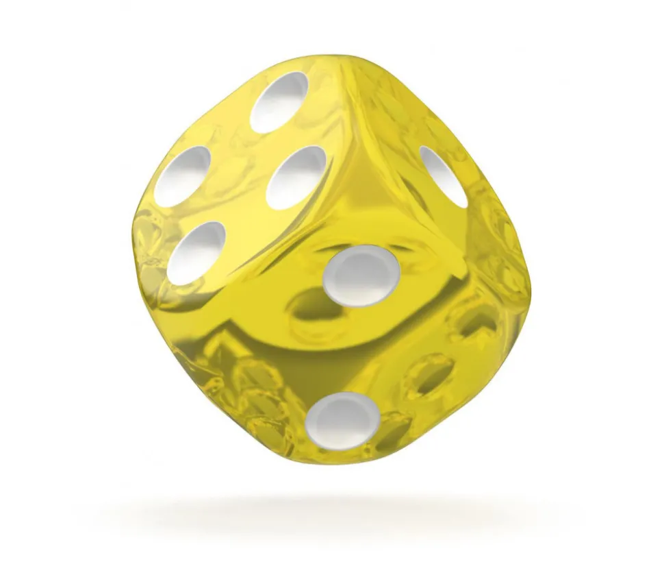 Dé à jouer D6 jaune translucide Oakie Doakie. Dé 6 faces transparent avec points blancs de 1 à 6.