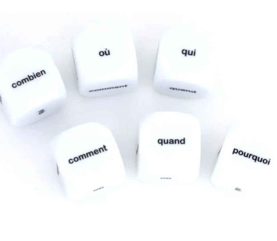 Dé spécial en français. Dé à jouer pour formation et jeux d’expression, grammaire en français. Accessoires de jeux pour apprentissage originaux. Adaptez vos jeux de société pour des règles spéciales. Pronom interrogatif.