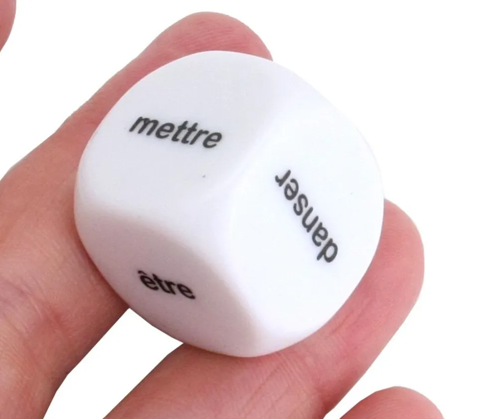 Dé spécial en français. Dé à jouer pour formation et jeux d’expression, conjugaison en français. Accessoires de jeux pour apprentissage originaux. Adaptez vos jeux de société pour des règles spéciales à l’école pour apprendre plus facilement les conjugaisons : auxiliaires, verbe 1er groupe, verbe 2e groupe et verbe 3e groupe.