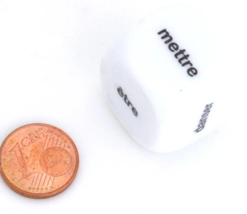 Dé 22 mm blanc avec 6 faces mots en noir.