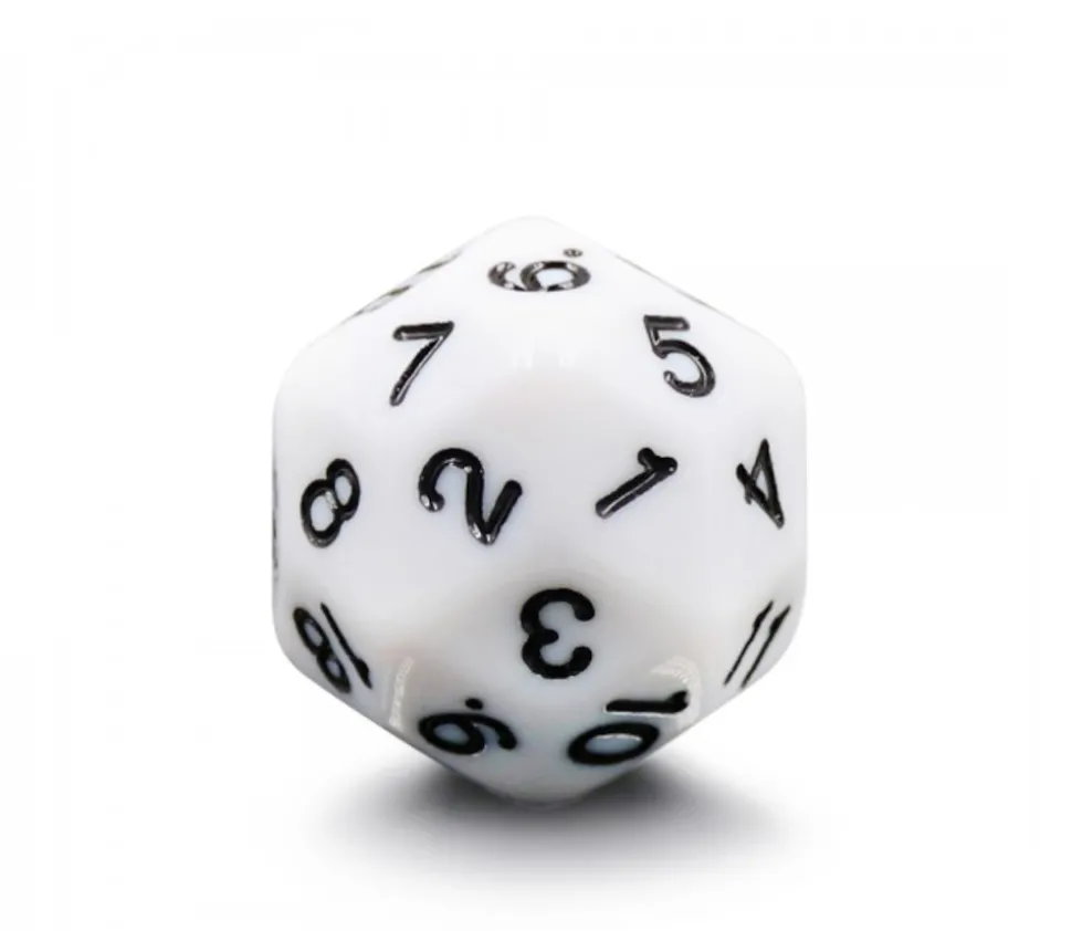 Dé multi-faces blanc avec chiffres de 1 à 30 gravés en noir.