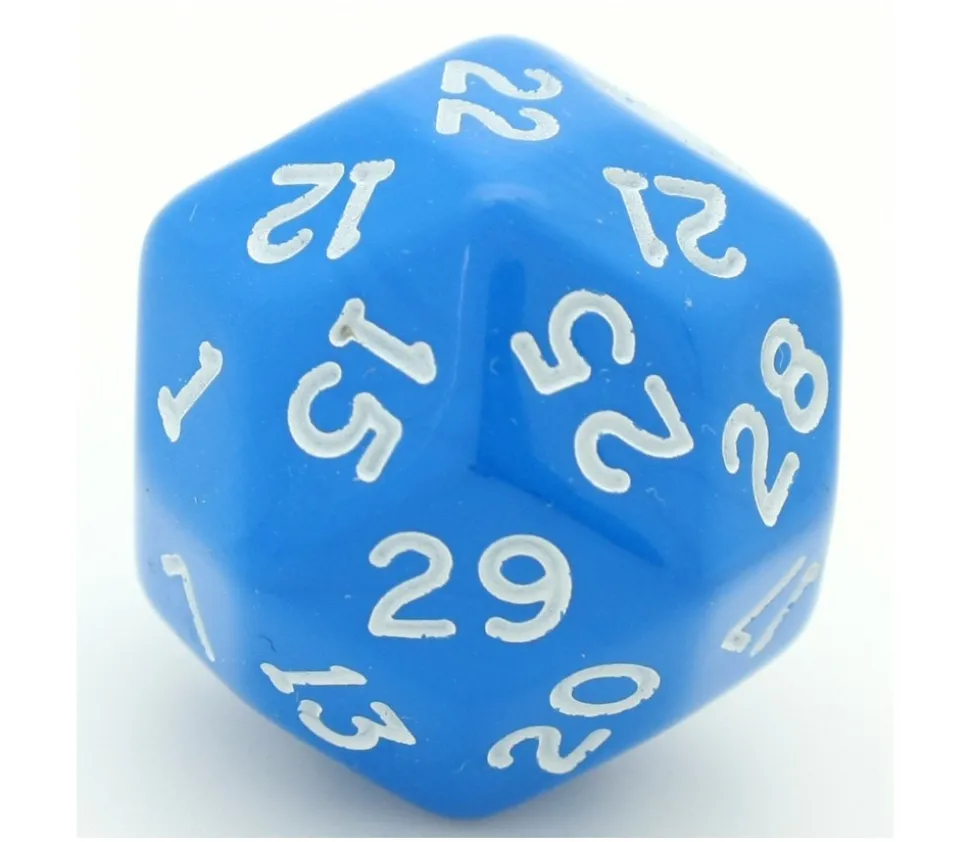 Grand dé opaque d’environ 30 mm (28.5 mm)de diamètre avec nombres de 1 à 30. Dé à jouer multifaces, idéal pour les jeux de rôles et certains jeux.