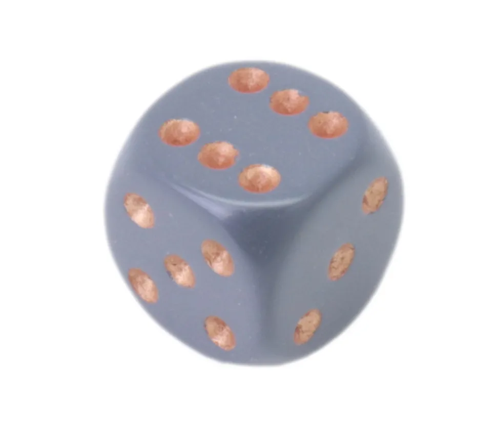 Dé de jeu en plastique gris avec gravage des points de 1 à 6 en couleur cuivre.