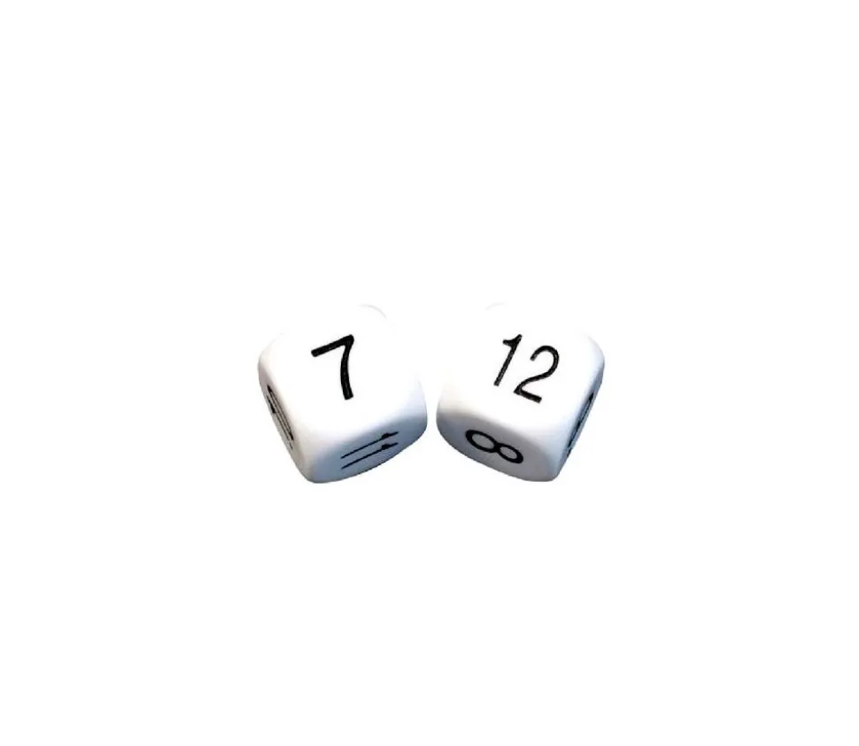 Dé à jouer de 7 à 12 avec les chiffres à la place des points. Dé blanc en plastique et coins arrondis.