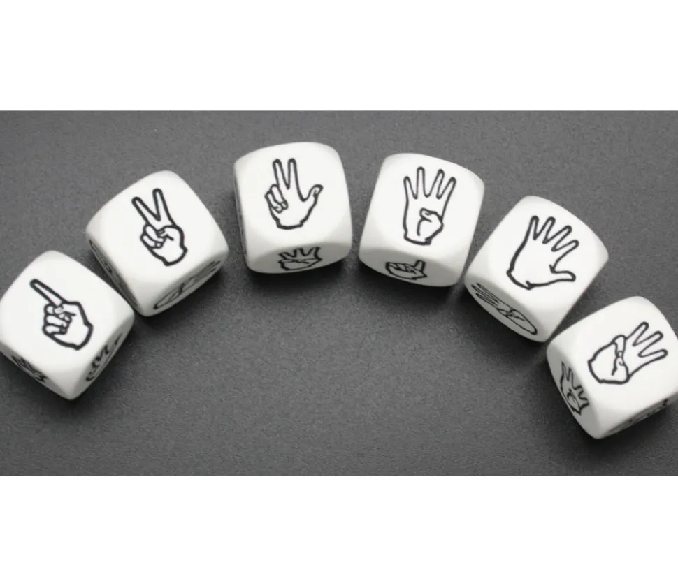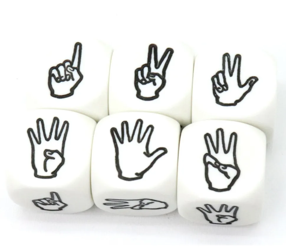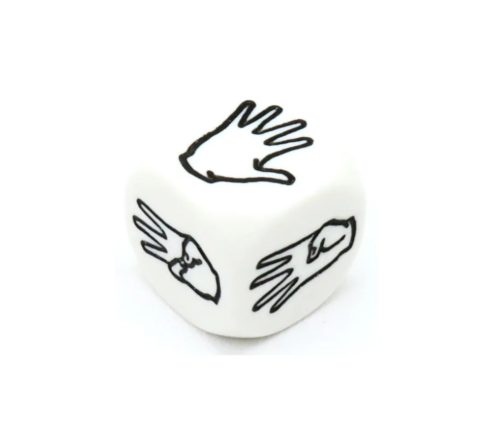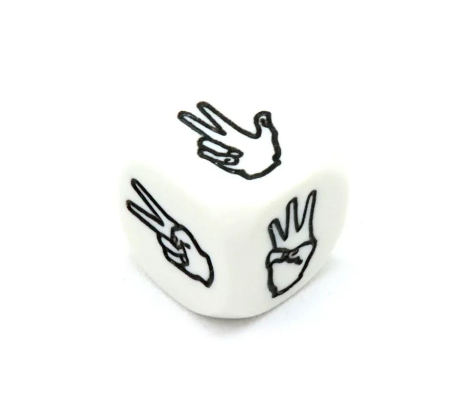 Dé blanc 2 cm aux coins arrondis avec des mains et le nombre de doigts levés en fonction du nombre que l’on souhaite.