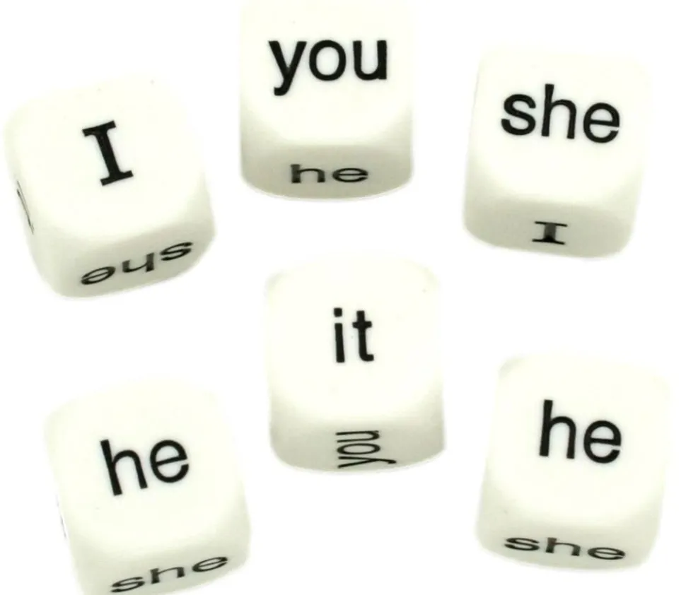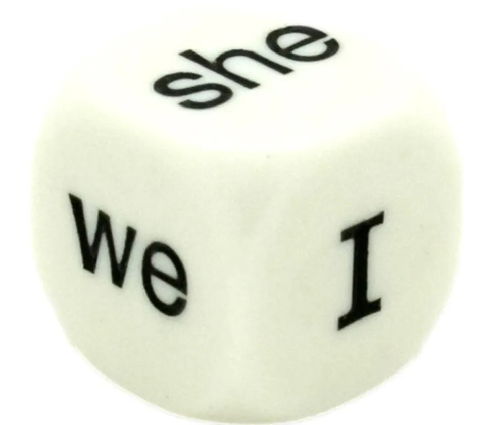 Dé anglais avec les mots suivants gravés sur les faces : I you he she it we