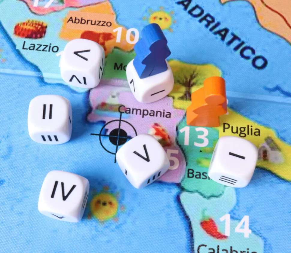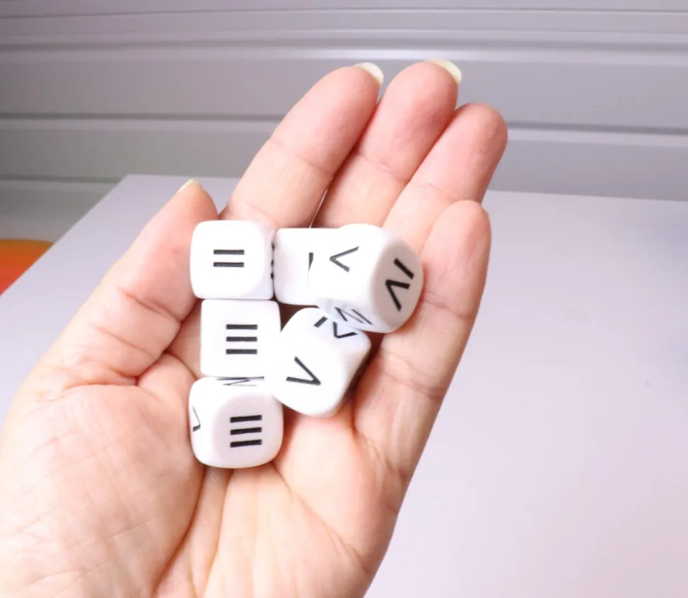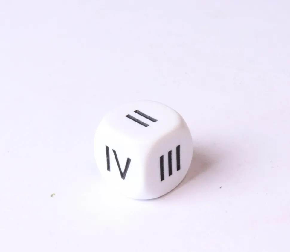 Dé en plastique blanc avec les chiffres romains sur les faces : I II III IV IV V.