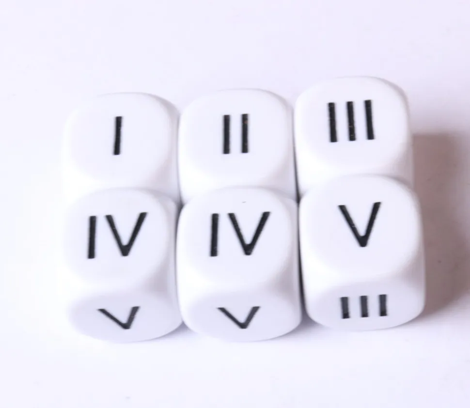 Dé chiffres romains I II III IV IV V. ATTENTION 2 fois le 4 et pas de 6.