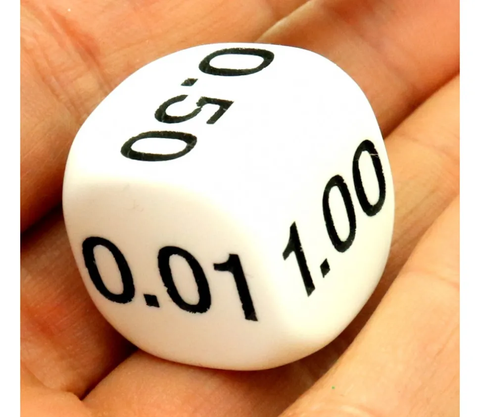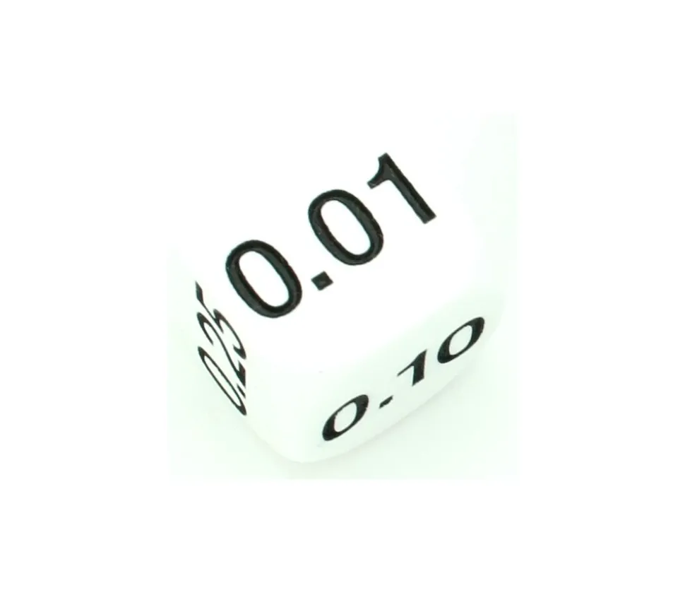 Dé décimal 0.01, 0.05, 0.25, 0.10, 0.50, 1. Grand Dé à jouer blanc de 22 mm avec des chiffres à décimal. Dés pous jeux mathématiques en classe.