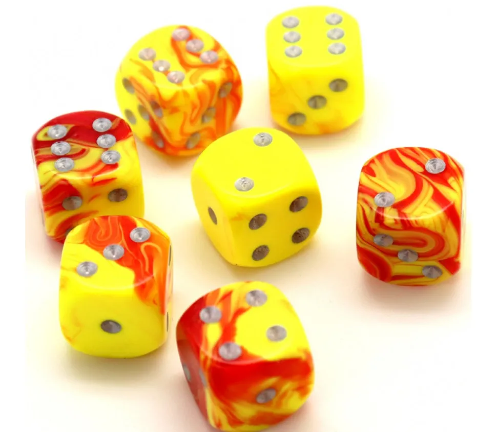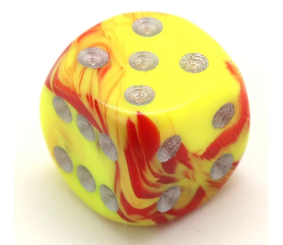 Très beau dé à jouer design jaune et rouge effet coulure de peinture. Points gravés argentés. Dé artistique colorés de 15 mm avec points de 1 à 6. Superbes couleurs avec effets de couleurs mélangées sur les faces. Chaque dé est différent et possède des coulures particulières. Achat dé à la pièce. Dé à jouer pour jeu de société.
