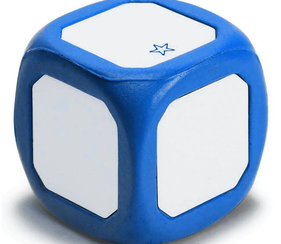 Dé avec faces blanches à personnaliser. On écrit, on joue, on efface et on recommence avec un autre thème le lendemain.