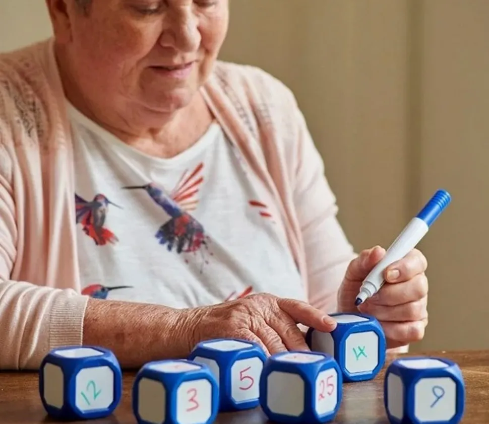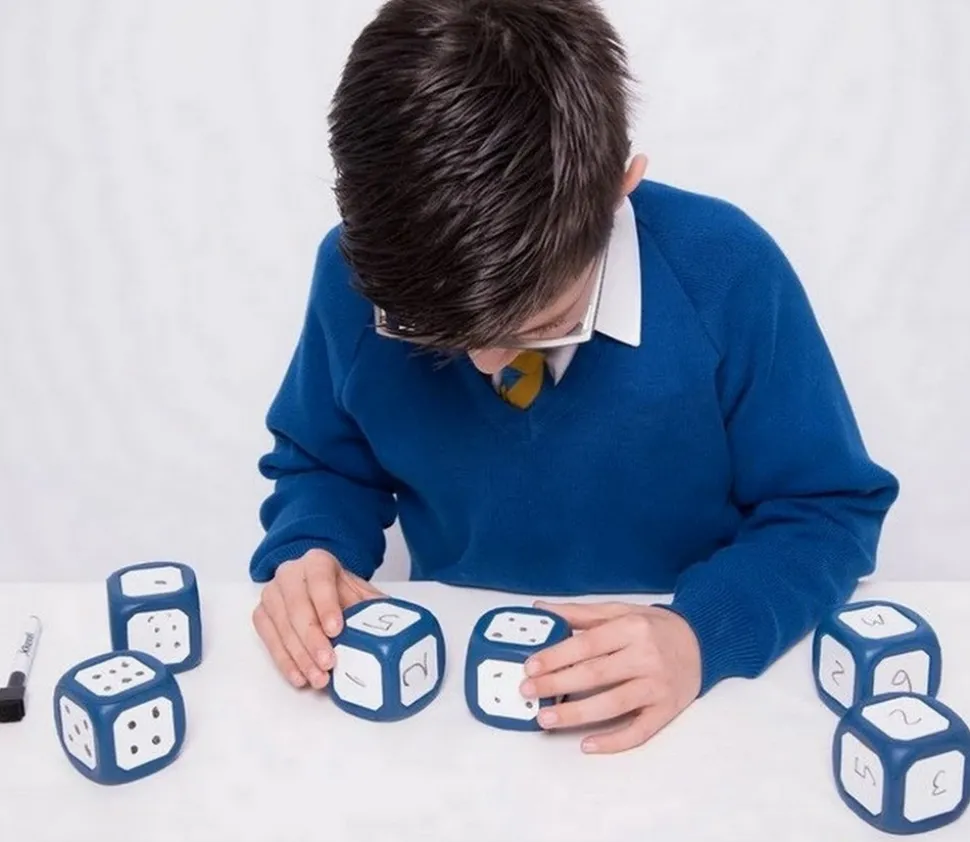 Dé à jouer dont vous pouvez modifier facilement les faces en écrivant avec des feutres effaçables de type velleda.