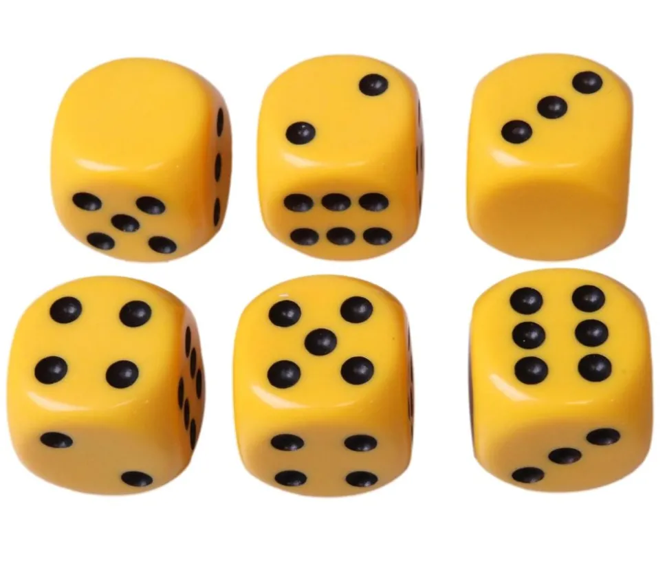 Dé de 2.5 cm en plastique jaune orange, vert ou rouge avec marquage en noir ou blanc des points en creux de 1 à 5.