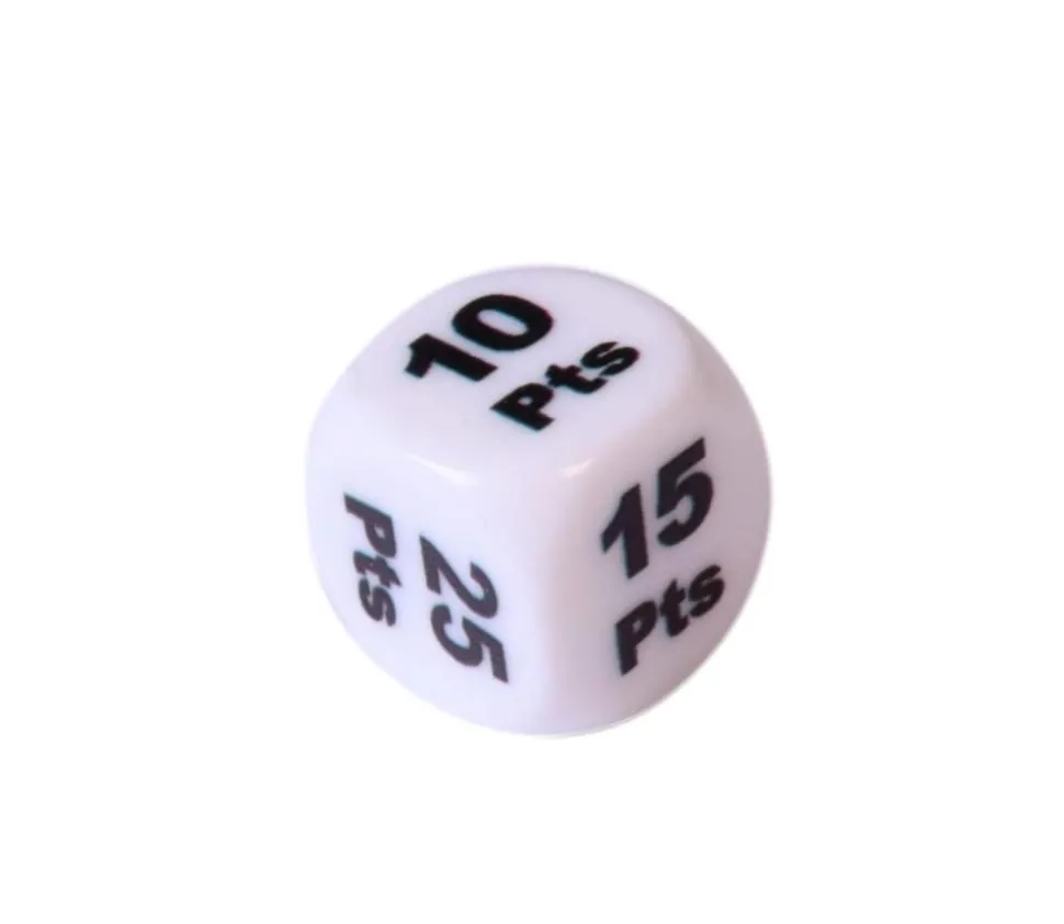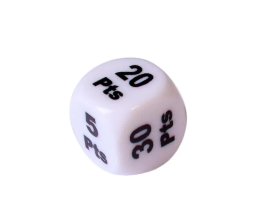 Dé à jouer avec points de jeu avec les faces suivantes +5 pts +10 pts +15 pts +20 pts +25 pts +30 pts. Dé à jouer blanc coins arrondis de 16 mm avec des points positifs pour ajouter des points lors d’une partie de jeu de société.