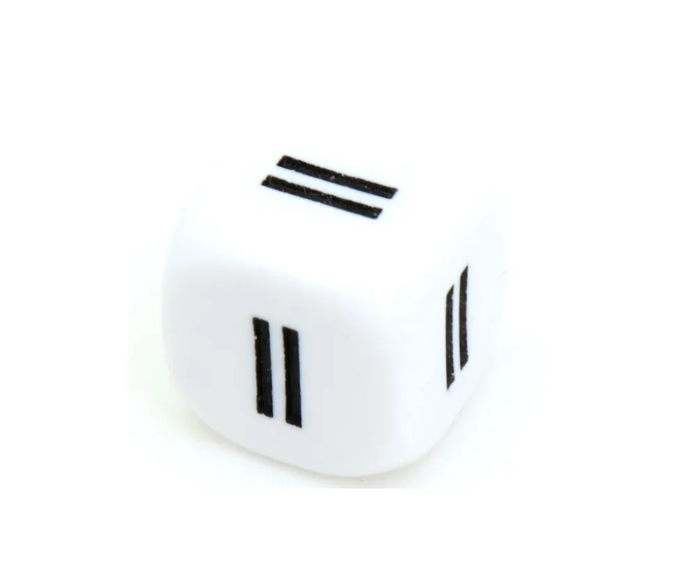 Couleur du dé blanc. Gravage en noir sur les six faces du symbole mathématique =.