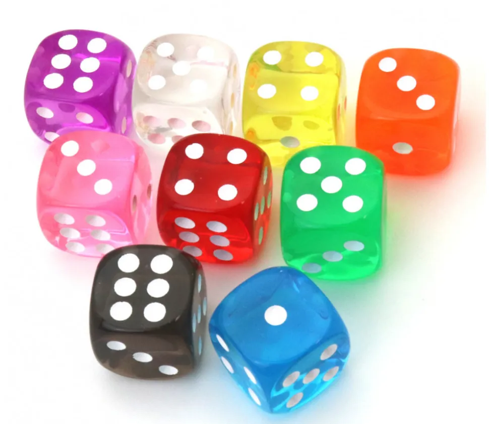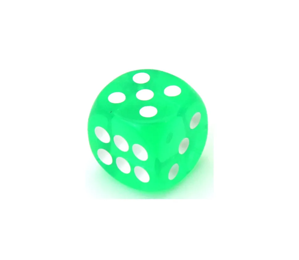 Dé à jouer translucide de 16 mm pour créer ou compléter un jeu. Dé plastique transparent coloré vert, on voit à travers le dé. Dé avec des points de 1 à 6 pour mettre de la couleur dans vos jeux.