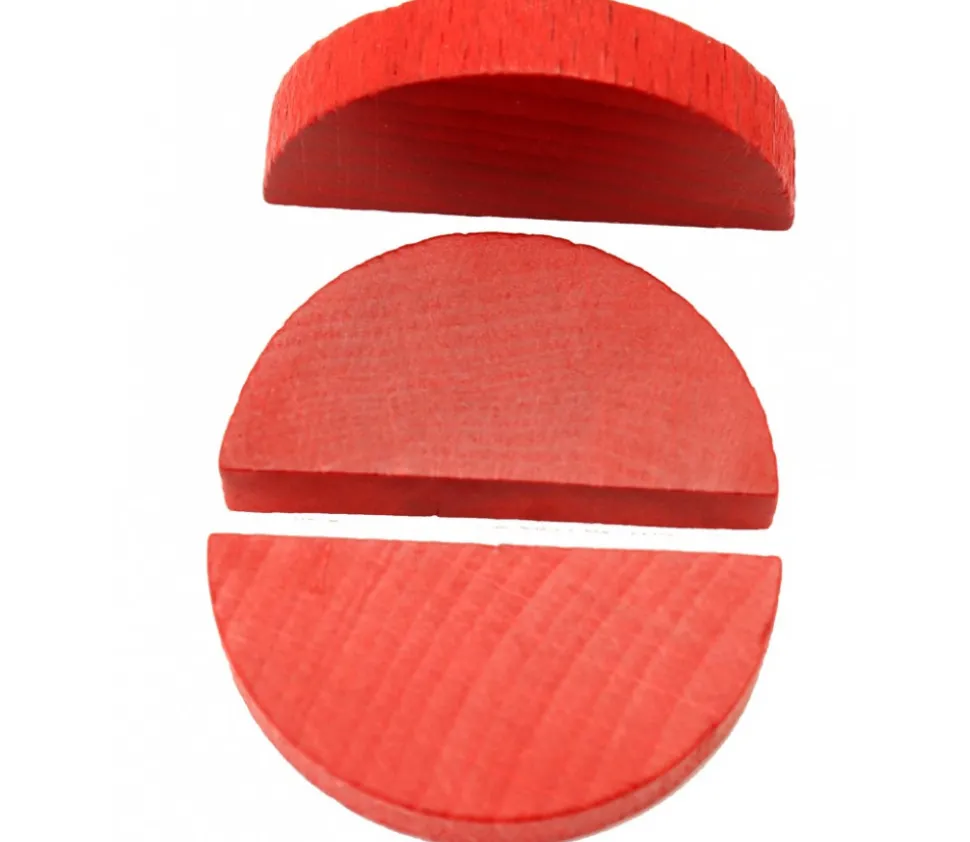 Petite moitié de rond rouge en bois pour vos jeux de société. Pion en bois teinté rouge. Demi palet pour créer des bricolages en travaux manuels ou loisirs créatifs
