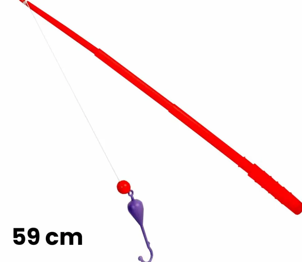 Dimensions de la canne à pêche : 59 cm de long + Fil de 46 cm + Crochet de 14.5 cm