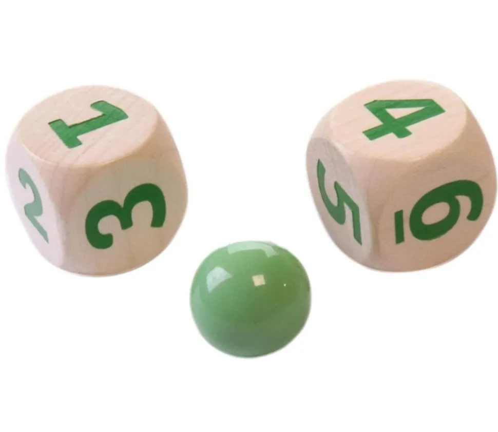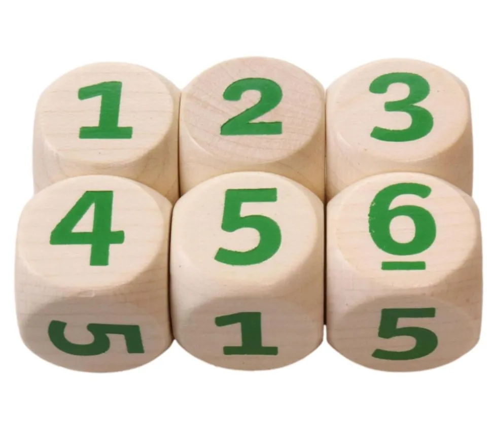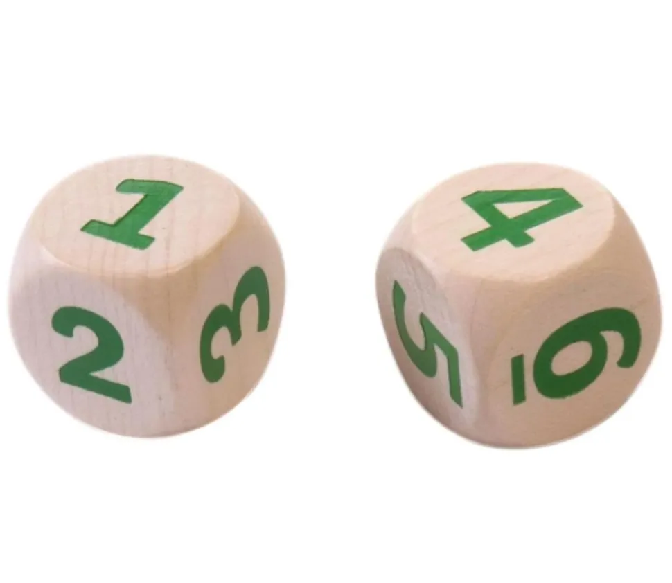 Dé bois assez gros bien lisible, aux coins arrondis avec les chiffres 1 2 3 4 5 et 6 inscrits en vert.