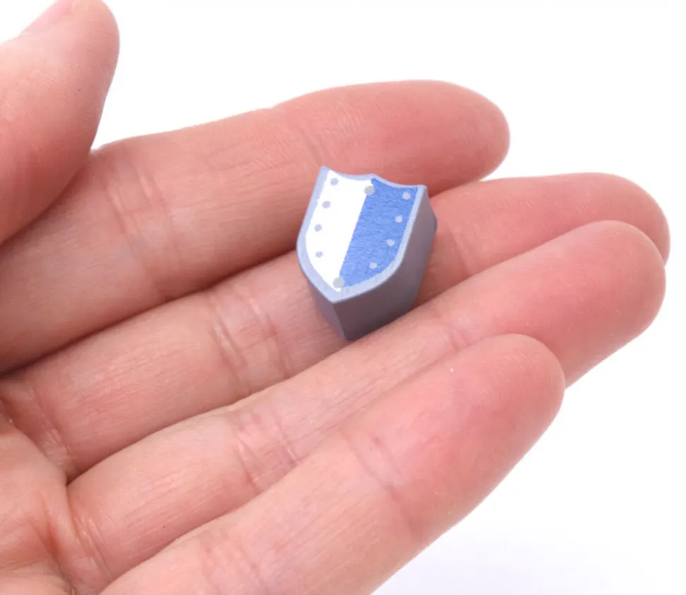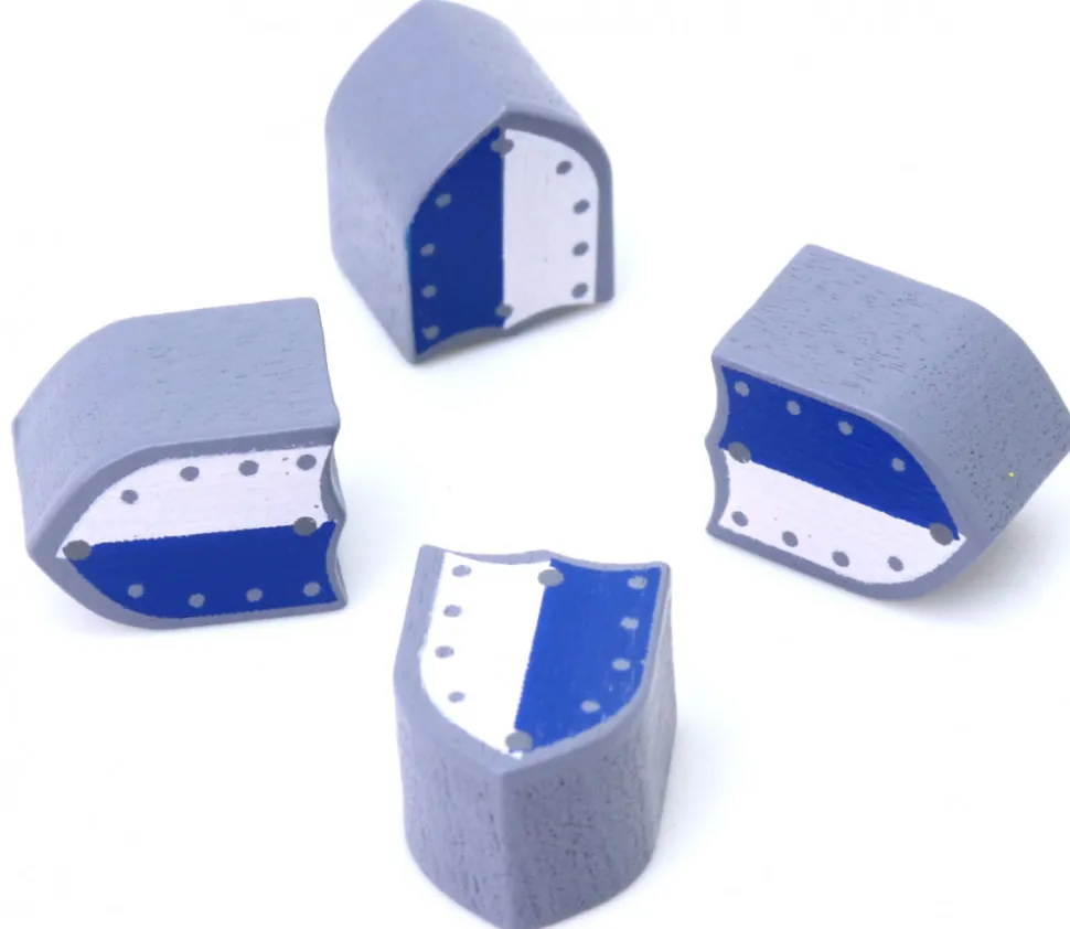 Jeton en bois forme bouclier avec impression d’un blason bicolore clouté sur les deux côtés. Joli jeton en bois pour vos jeux thème de la guerre, du moyen-âge et jeux de stratégie. Pour remplacer vos jetons perdus et pour créer de nouveaux jeux de société. Original avec sa bannière cloutée blanche et bleue. Jeton en bois peint 16 x 12 x 5 mm. Vendu à l’unité.