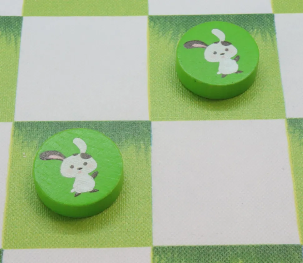 Jeton de jeu lapin blanc sur fond vert-clair en bois. Petit pion avec impression recto d’un petit lapin blanc.