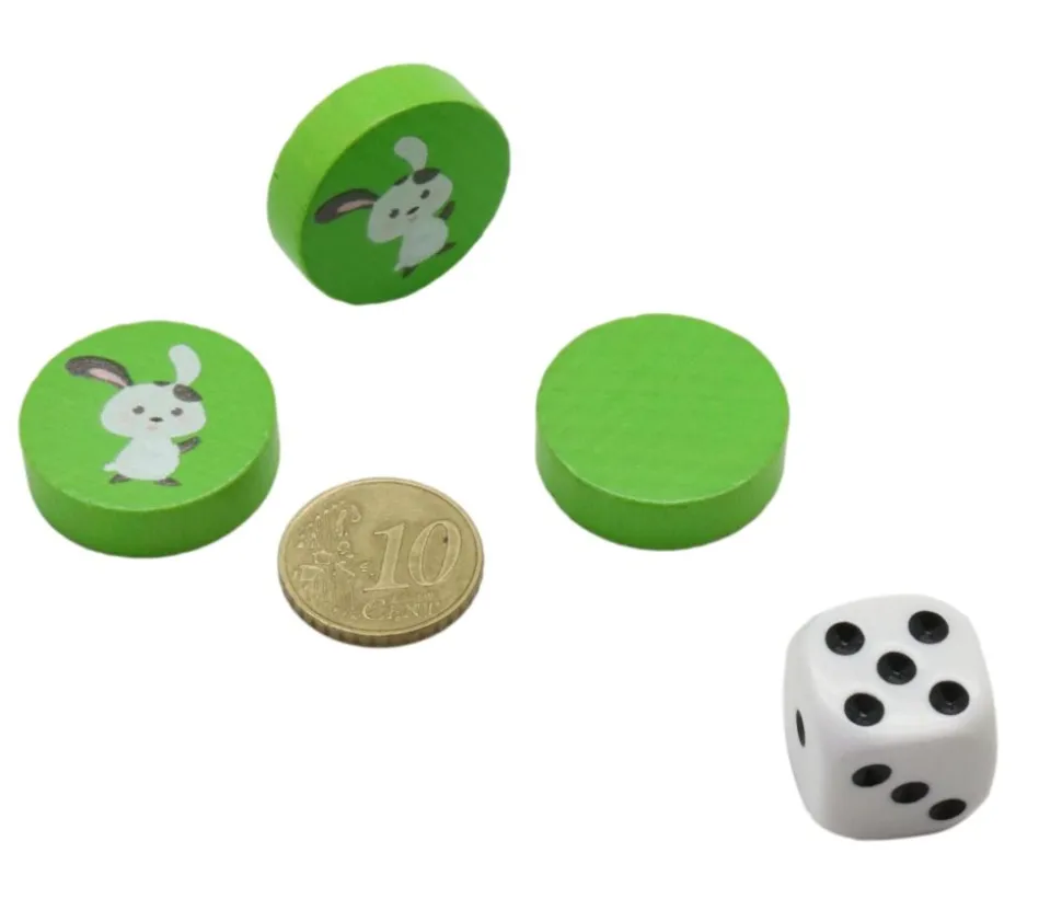 Jeton de jeu en bois représentant un petit lapin blanc avec une impression sur une seule face, la face verso est vert clair sans impression.