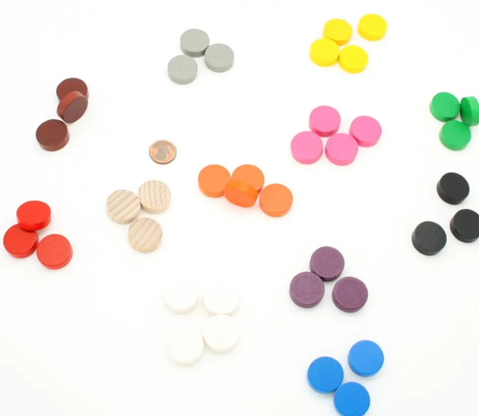 Pions en bois ronds de 1.9 x 0.6 cm. Petits jetons ronds de 19 mm de diamètre pour vos jeux. 12 couleurs disponibles : gris, violet, orange, rose, rouge, vert, jaune, bleu, noir, blanc, naturel, marron. Mini disque chevalier. Pièce du jeu Colon de Catan (extension villes et chevaliers).