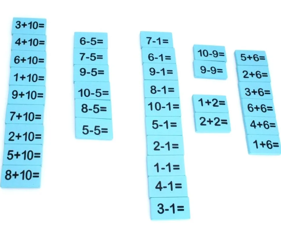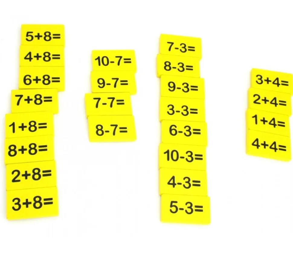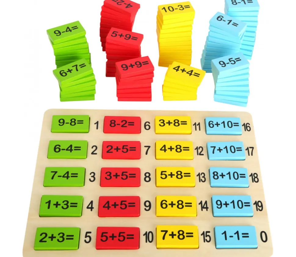 - 109 plaquettes opérations en bois coloré de 4.5 x 2.5 cm x 0.6 cm avec impression en noire sur une face de l’opération mathématique.