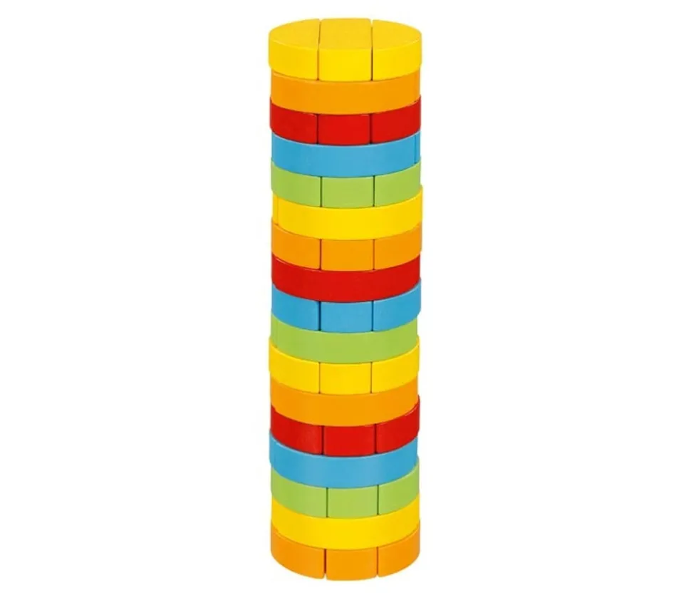 Tour en bois ronde multicolore de 17 cm de haut et 5 cm de diamètre composée de 51 blocs en bois. Pour ce jeu de société en bois, il vous faudra allier concentration et habileté. Ne tremblez pas ! Chacun à leur tour, les joueurs retirent une pièce de l’édifice pour la poser en haut de la tour. Attention à ne pas faire tomber la structure. 48 blocs rectangulaires et en forme d’arc en bois couleur de 5 x 1.6 x 1 cm à empiler.