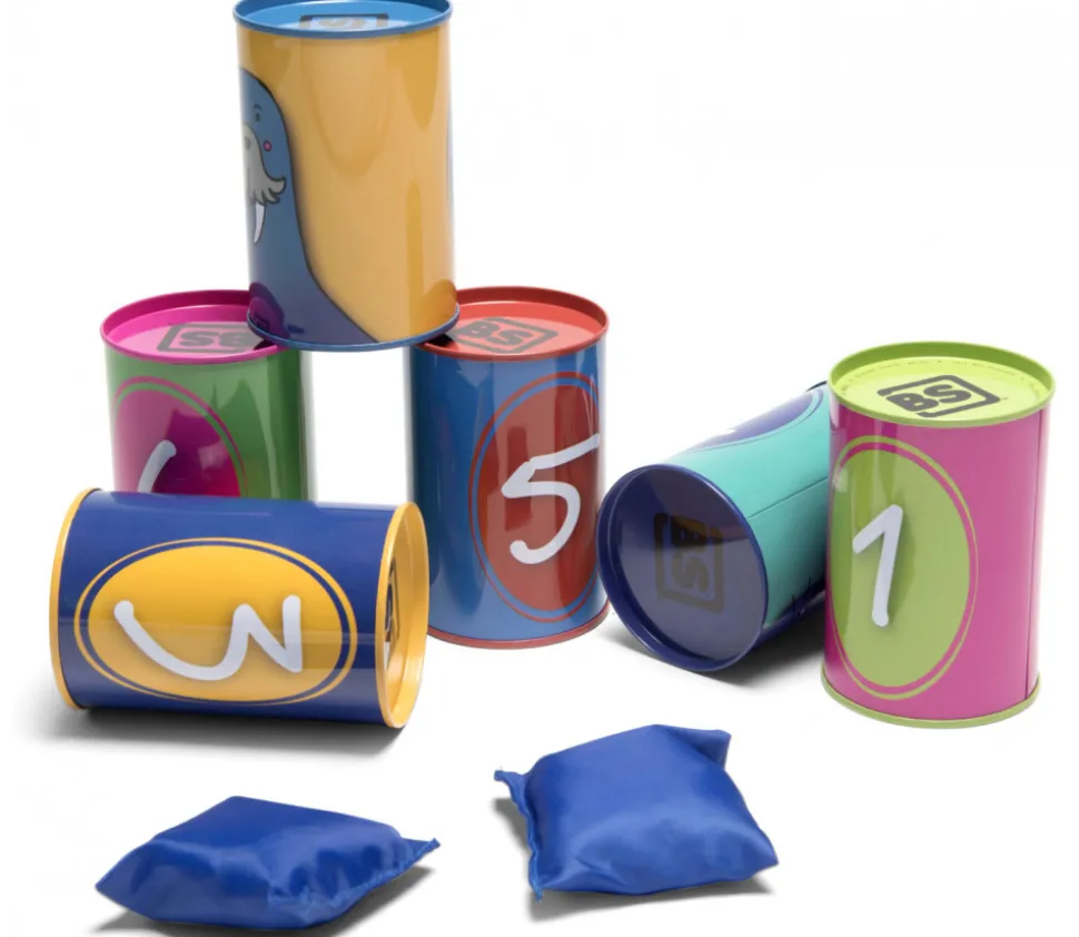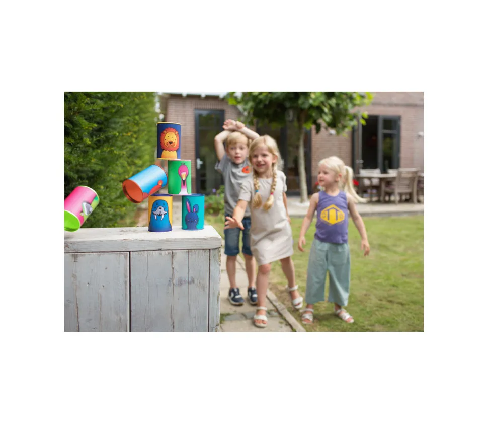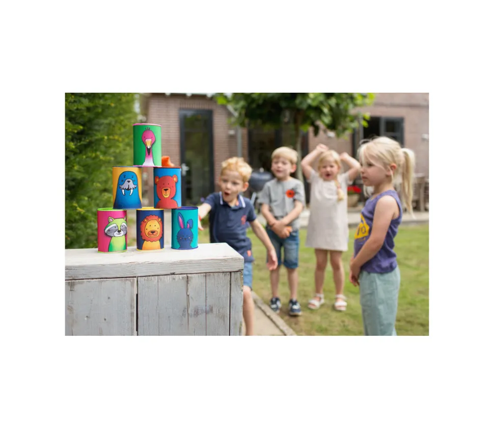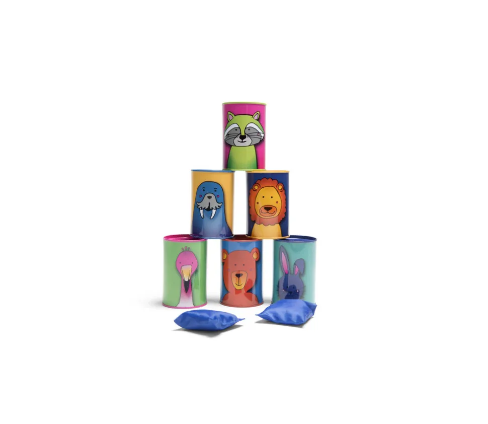 Jeu de chamboule tout Animaux (casse-brique). Un lot comprenant 6 mini tonneaux numérotés de 1 à 6 pour vos animations, fêtes et kermesses. Le set comprend : 6 tonneaux métalliques 10 cm, 3 sacs de lancer en tissu sans danger. Jeu des boites à faire tomber. Un grand classiques des kermesses. Super pratique ce set de canettes sécurisées et numérotées. Un très beau lot avec un animal différent sur chaque boite et de jolies couleurs. Casse brique pour les enfants.
