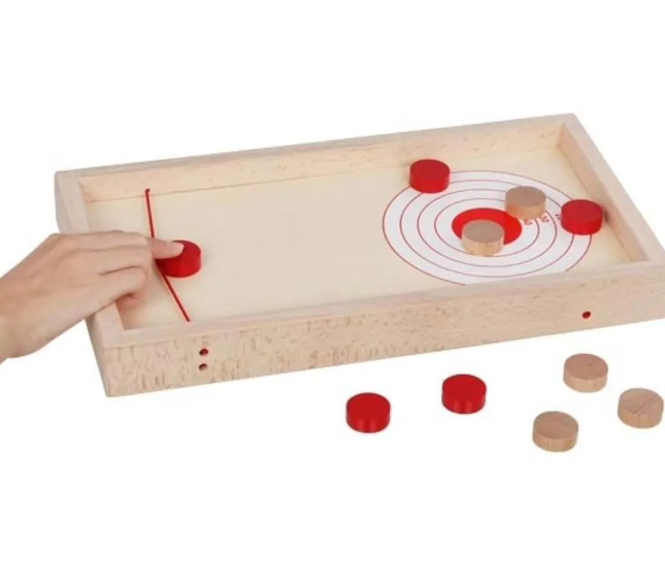Jeu d’adresse où chaque joueur a 5 palets qu’il faut envoyer dans l’autre camp à travers le trou situé au centre du plateau. Le gagnant est celui qui réussit à envoyer toutes ses pièces dans le camp de l’adversaire.