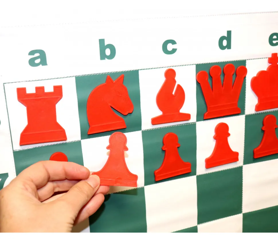 Facile à manipuler. Très visuel grâce à la forme des pièces, il vous permet de faire comprendre facilement des déplacements ou techniques du jeu d’échec.