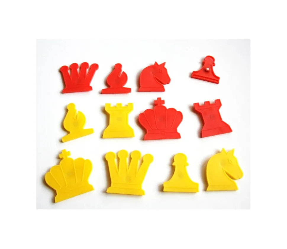 - 32 pièces d’échecs en plastiques 16 rouges et 16 jaunes avec des aimants au dos. (dimensions environ 5.5 x 6.5 cm)