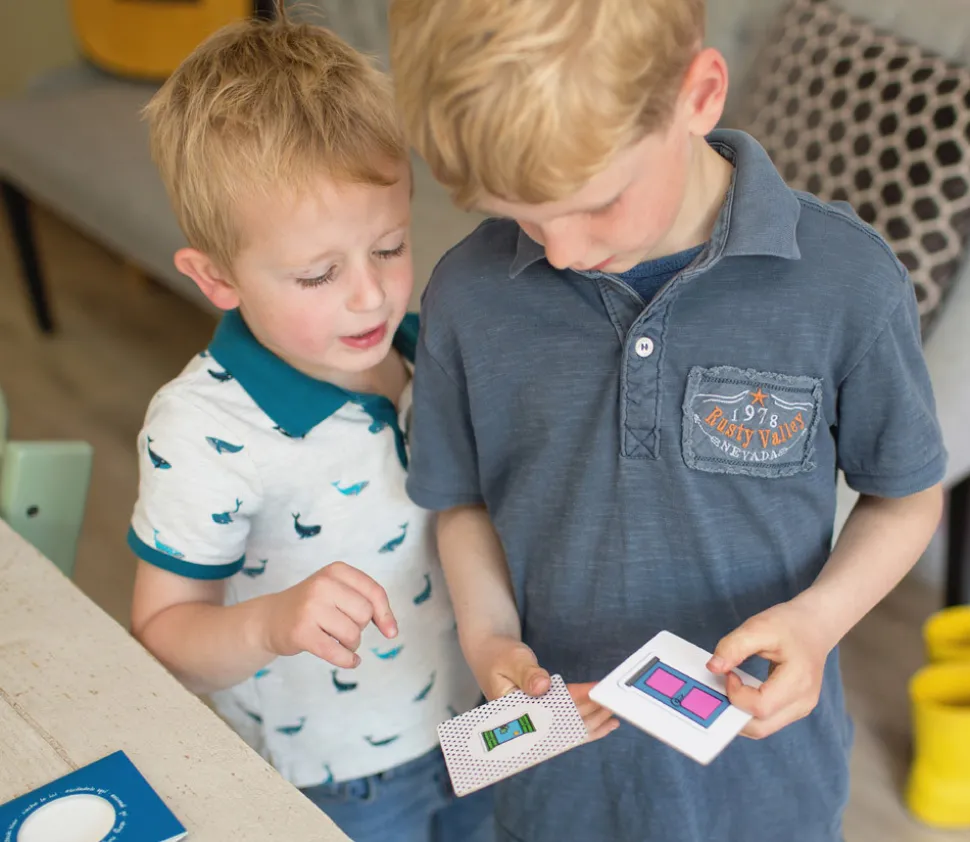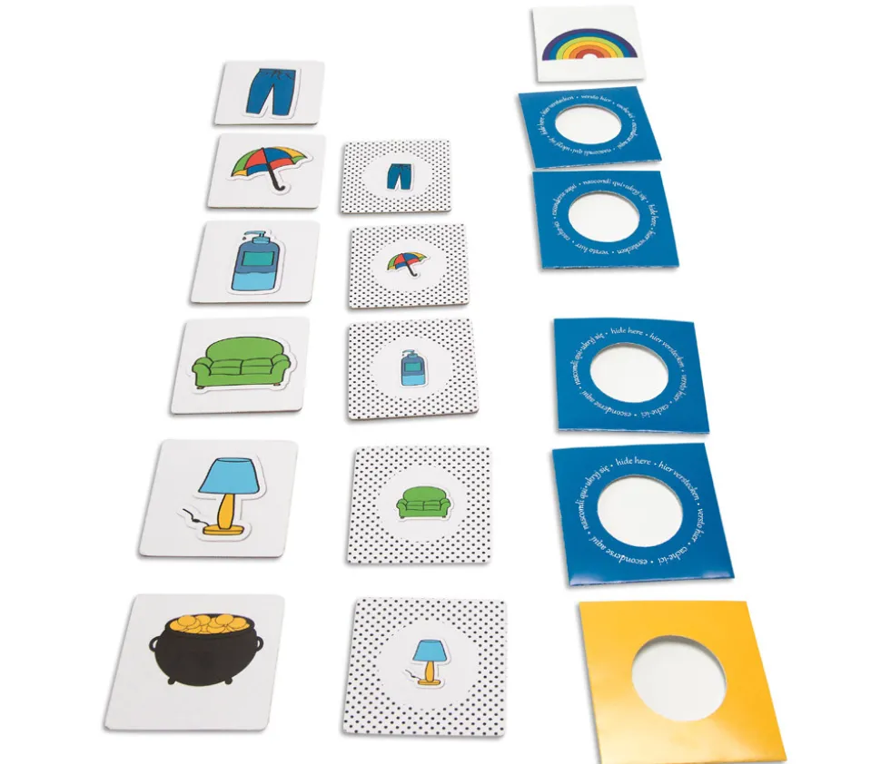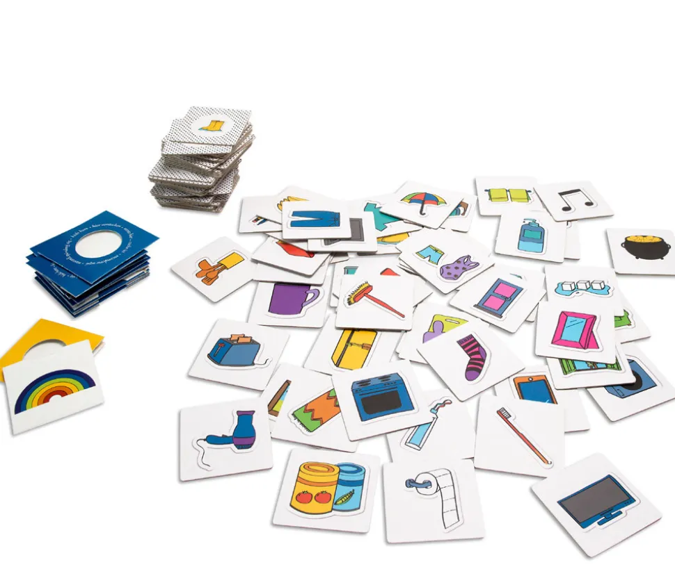 Puis il décale les colonnes et place les cartes dans les enveloppes. Par la fenêtre de l’enveloppe on voit l’objet recherché. En ouvrant l’enveloppe les enfants découvrent la deuxième carte (à pois) qui est le nouvel objet à trouver. On cache les enveloppes dans les lieux où se trouvent les objets (le canapé, les bottes dans l’armoire à chaussure, etc.).