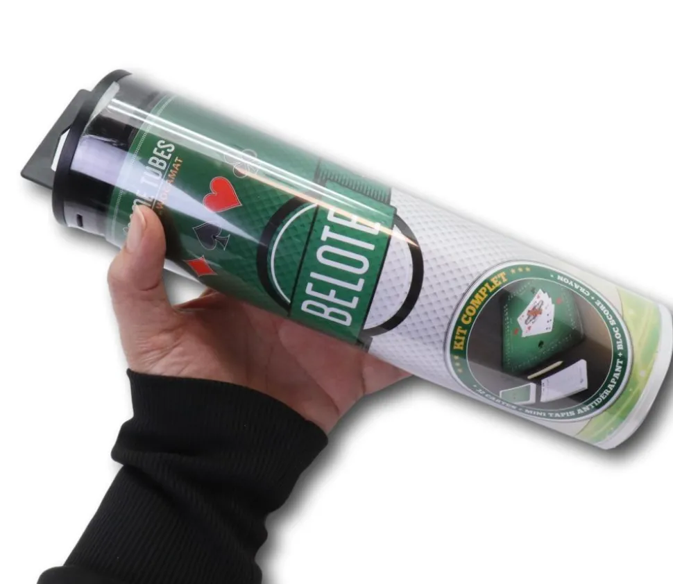 Tout pour la Belote game tubes : Ce kit est complet avec le tapis de carte, le jeu de 32 cartes, un bloc pour noter les scores et le crayon.