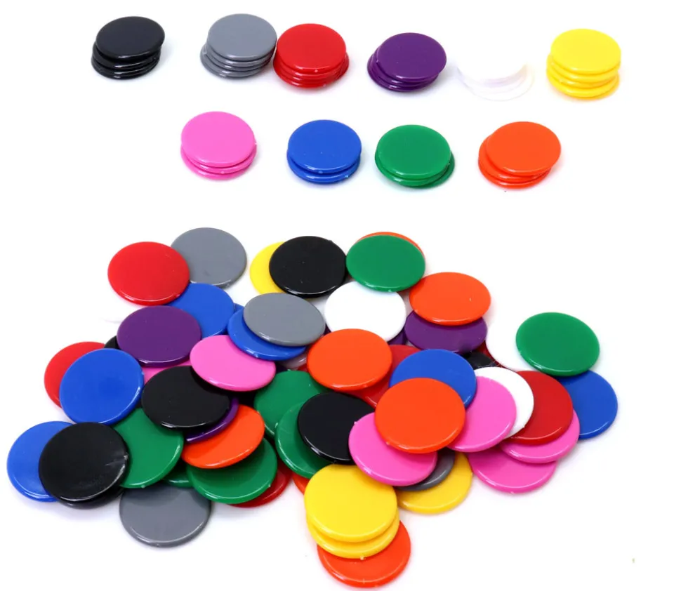 Set de 100 jetons en plastique plats de 2 cm de diamètre.