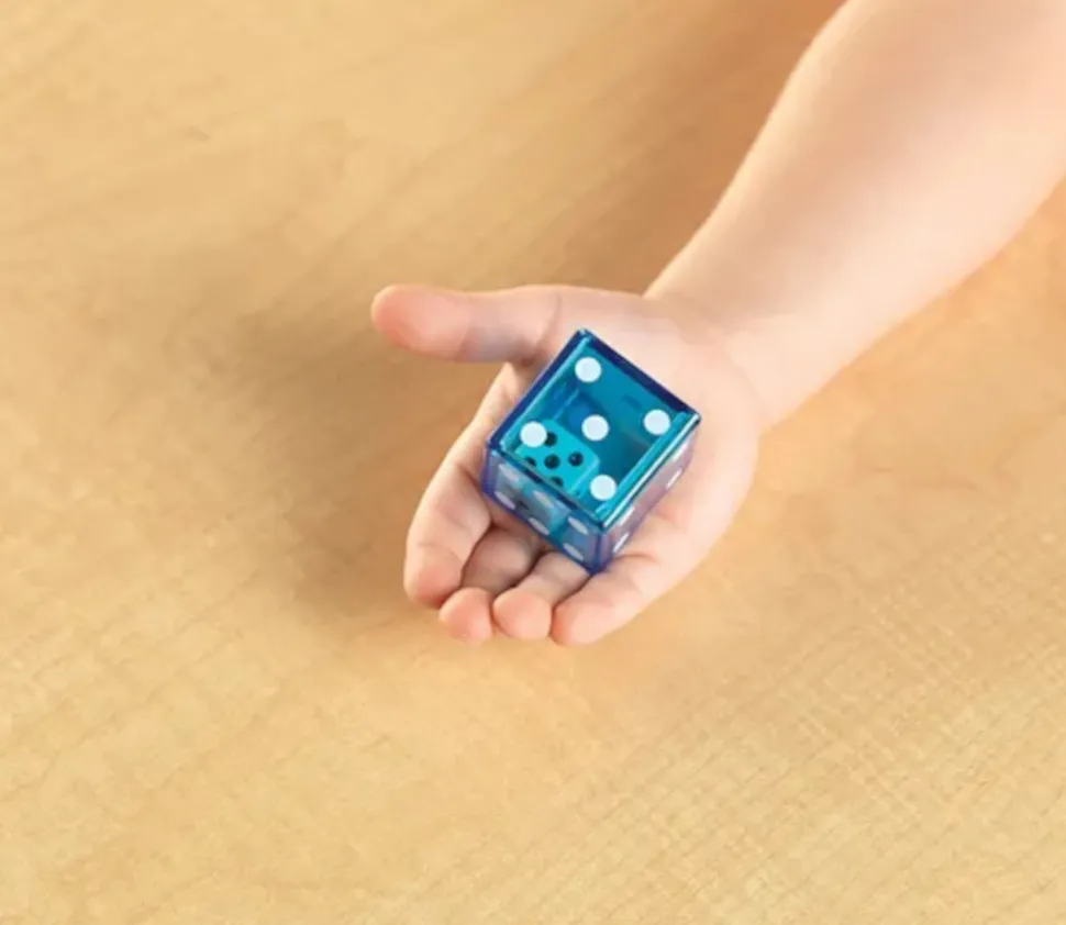 Chaque dé transparent de 3,2 cm renferme un dé plus petit de 1,6 cm avec les chiffres de 1 à 6. Ce dé plastique rigolo permet de lancer deux dés en même temps, offrant des possibilités variées pour additionner, multiplier ou soustraire les résultats. Ce lot comprend des dés aux couleurs vives: rouge, bleu, jaune, violet, vert et orange.