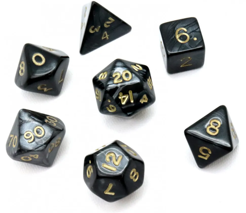 Lot de 7 dés à jouer perlés multifaces noir intense avec points dorés.