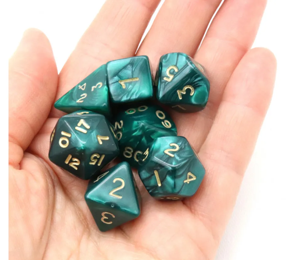 Lot de 7 dés à jouer perlés multifaces vert.