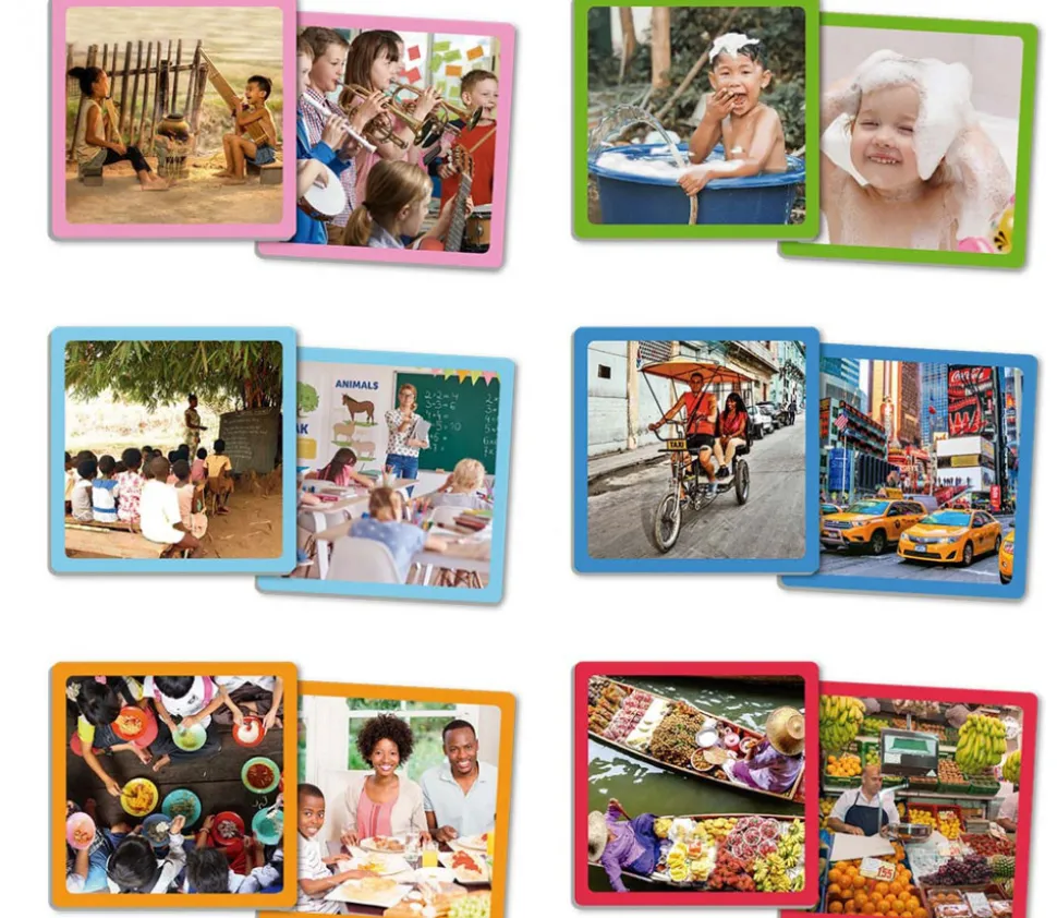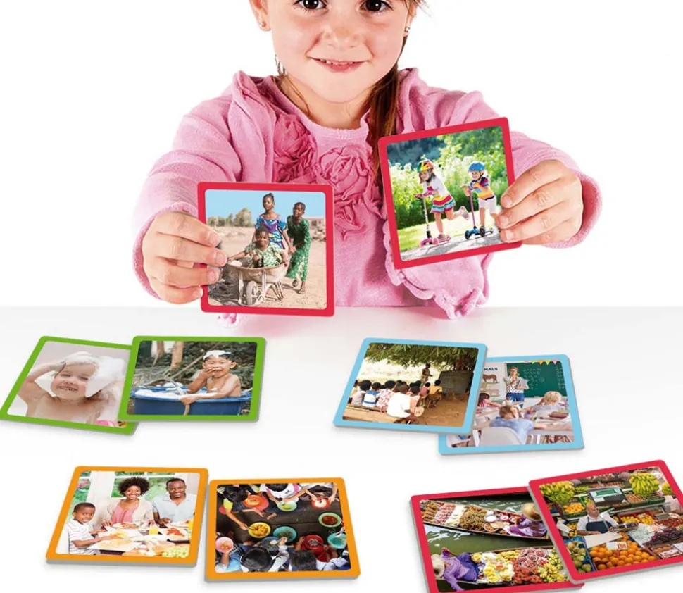 Avec ce Memory d’images réelles sur de grandes fiches, tu découvriras comment on vit dans d’autres endroits et tu apprendras la grande diversité qui existe dans le monde d’aujourd’hui.