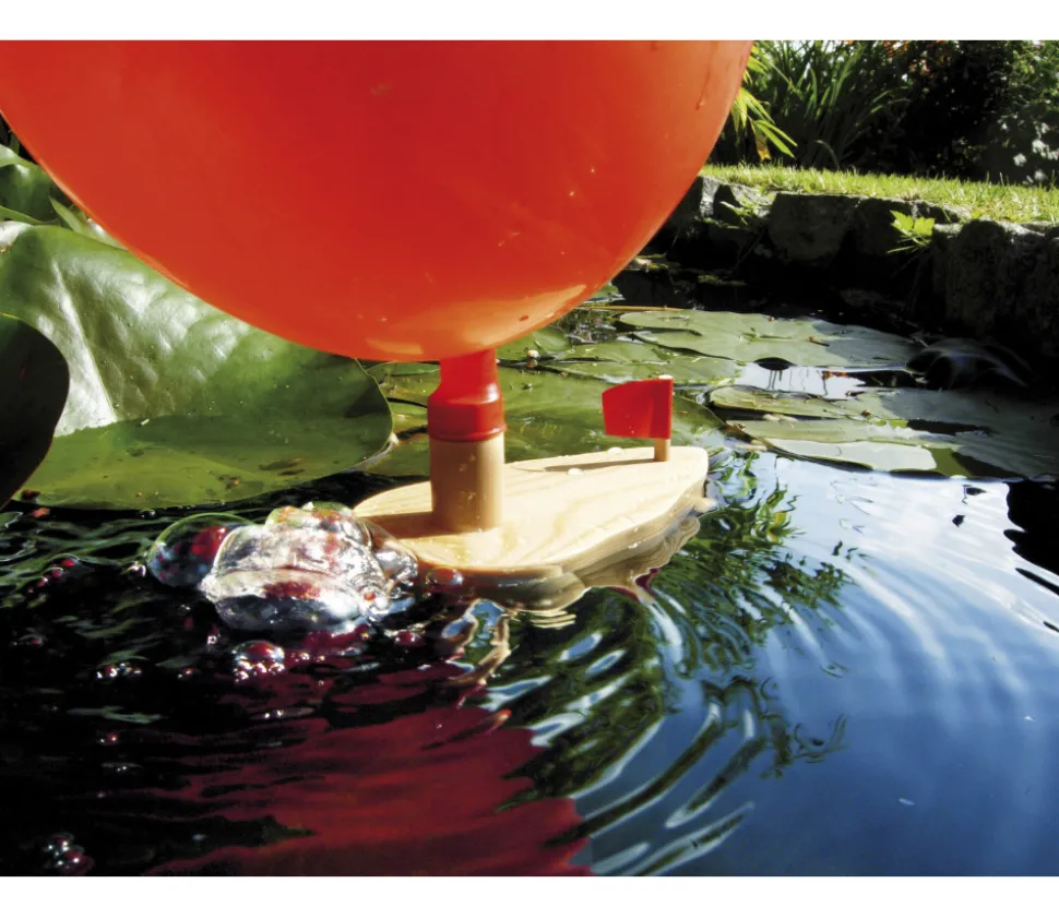 Mini bateau avec ballon gonflable qui propulse le bateau en avant sur l’eau. Gonflez un ballon de baudruche et mettez le sur système spécial du bateau, lâchez-le et le bateau avance tout seul grâce à l’air que propulse le ballon en se dégonflant.