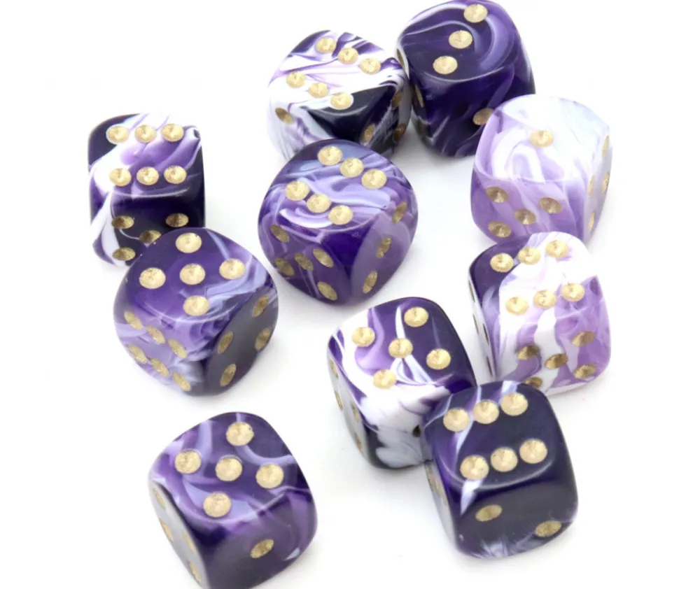 Mini Dé à jouer marbré violet. Superbe effet de couleur violet et blanc à l’intérieur du cube. Petit Dé 12 mm super sympa pour vos jeux (société ou jeux de rôle). Dés à jouer en plastique avec points dorés de 1 à 6 vendu à l’unité (dégressif par quantité). Coins arrondis, points gravés en doré. Chaque dé est différent et possède des couleurs et des effets différents, les dés sont uniques (la couleur peut être majoritairement violette ou majoritairement blanche cela dépend du mélange).