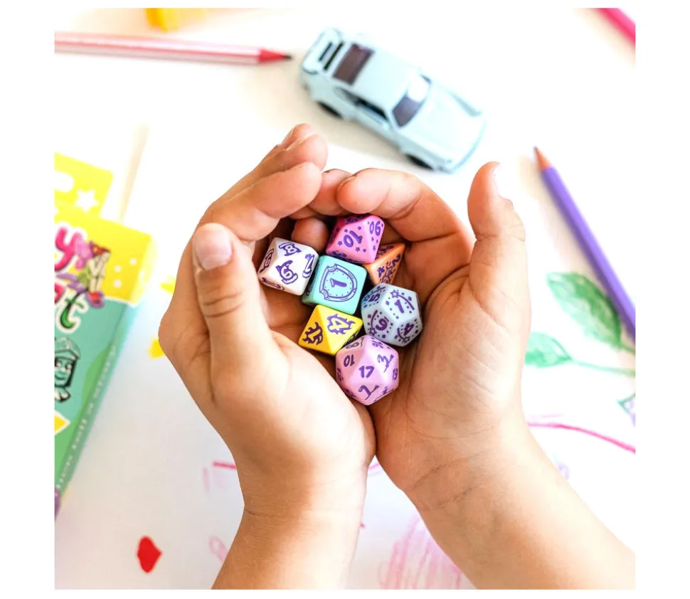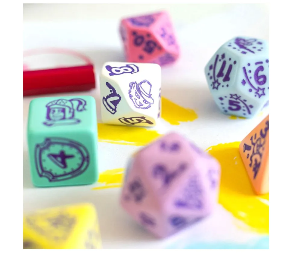 7 Dés multi-faces bien lisibles avec un graphisme adorable qui ravira les enfants ou les grands avec son style kawaii.