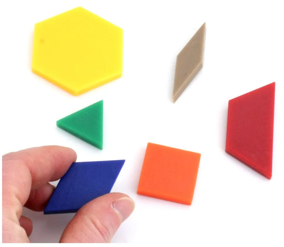 250 Formes géométriques plastique épais : 25 carrés oranges, 25 hexagones jaunes, 50 parallélogrammes bleus, 50 trapèzes rouges, 50 triangles verts et 50 losanges beiges. Idéal pour classement, création de figures, emboîtement, symétrie et mosaïques. Dimensions des carrés de 2.5 cm. Epaisseur des pièces 5 mm. Jeu des attributs et mosaïques.