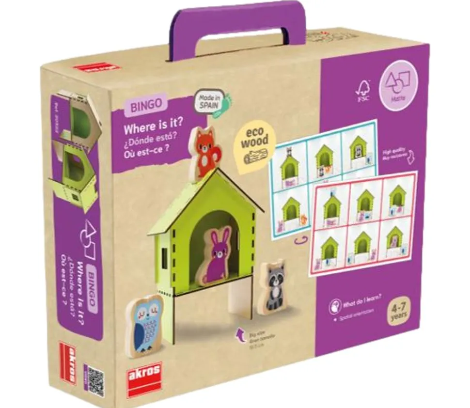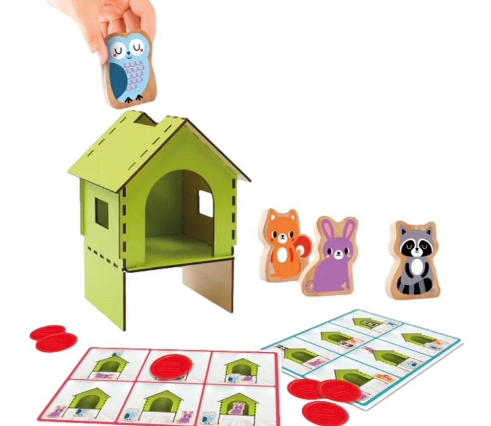 Contenu : 1 maison en bois à monter, 4 animaux rigolos en bois, 150 jetons de jeux et 25 fiches recto/verso : les animaux sont placés dans l’une des positions apparaissant sur les fiches et l’enfant doit retrouver sur sa carte s’il a la bonne représentation.