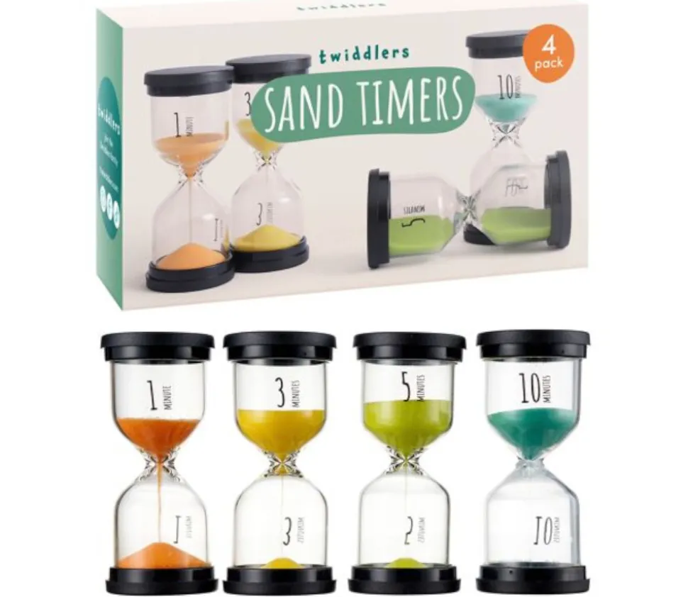 Sabliers en verre et PVC avec une couleur associée à chaque durée pour faciliter l’apprentissage chez les enfants.