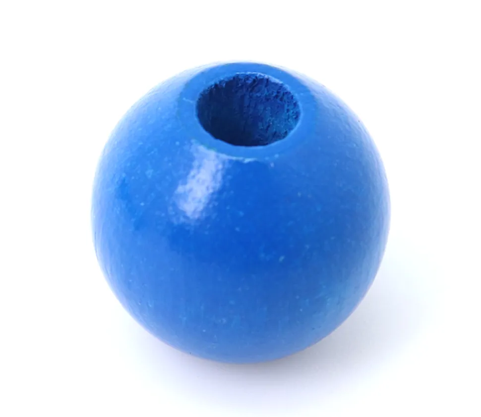 Perle ronde en bois de couleur bleue de 2 cm de diamètre avec perçage de 0.7 cm vendue à l’unité.