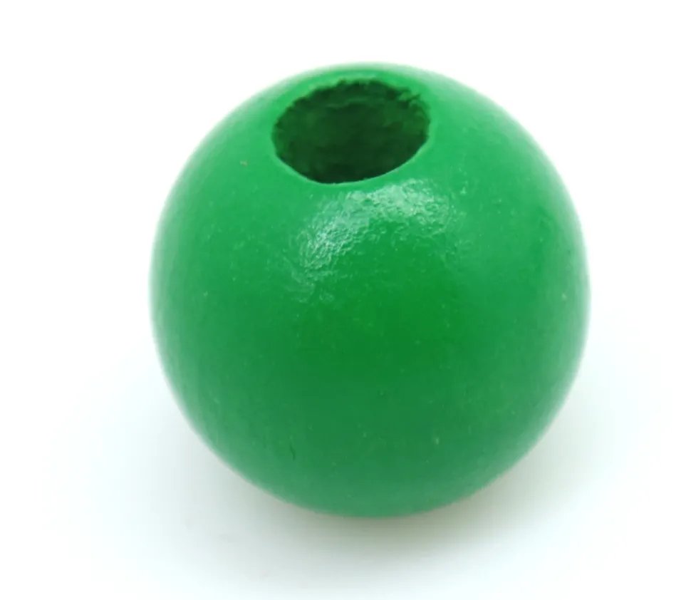 Perle ronde en bois de couleur verte de 2 cm de diamètre avec perçage de 0.7 cm vendue à l’unité.