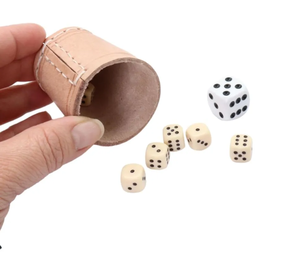 Petit gobelet lanceur de dés avec 5 mini dés à emporter partout avec soi et jouer au yams dès que l’occasion se présente